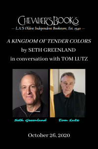 I will be in a virtual conversation with Seth Greenland to talk about his new memoir, A Kingdom of Tender Colors, on October 26, 2020, at 7:00 p.m.